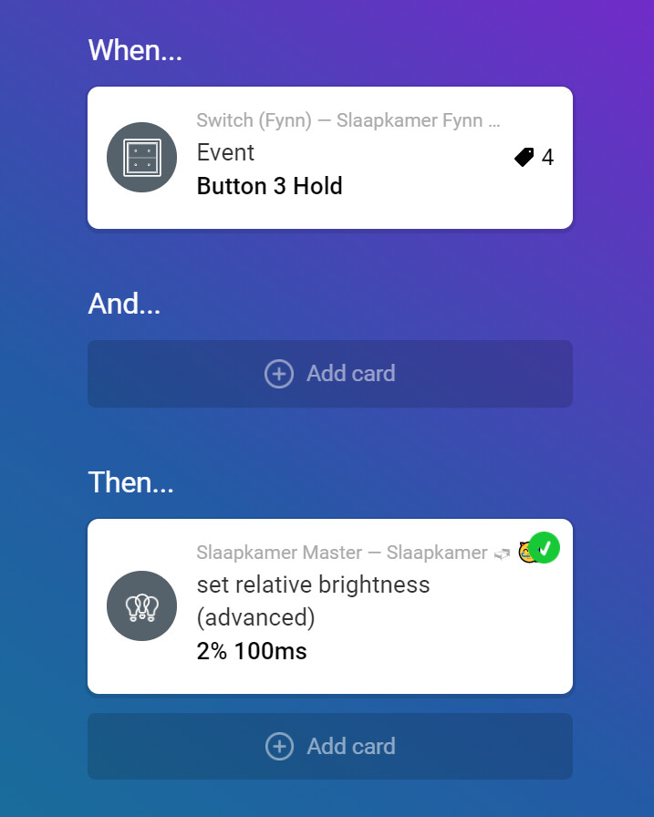 Different question, is there a way to create something like Fibaro does. Continuously press one button to dim from 0 to 100 or the other way around. How does one create something like that with a flow? I’m using Opple switches.