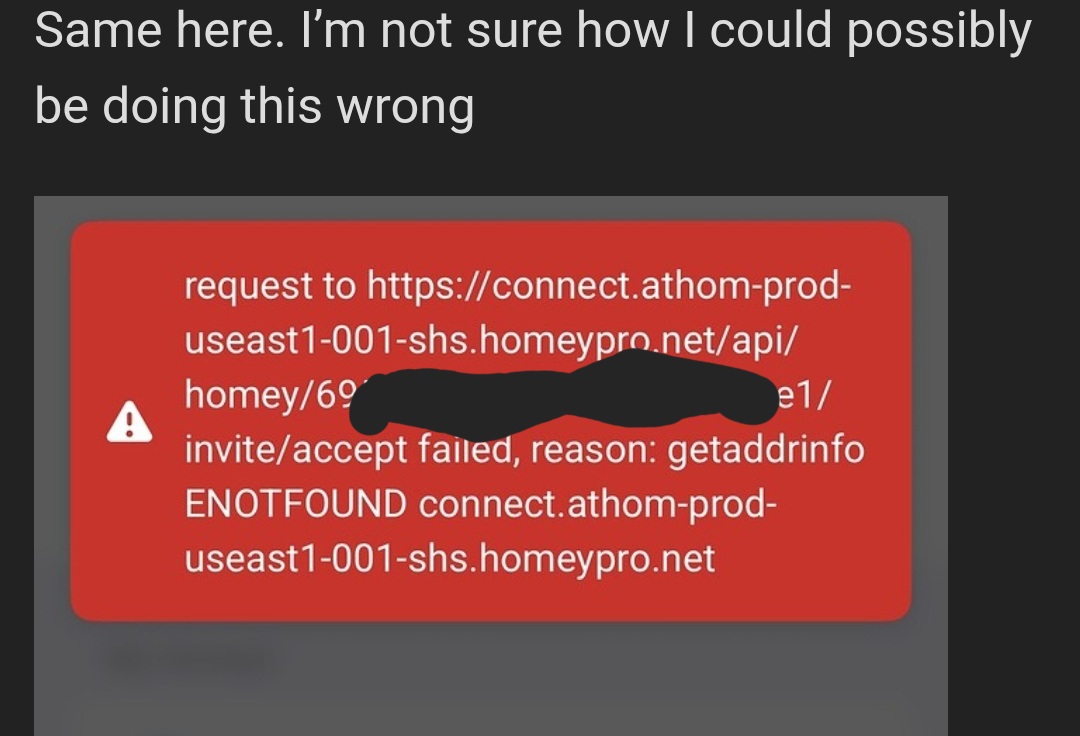 Via a standard non private edge window I get this error after clicking accept. “request to https://connect.athom-prod-useast1-001-shs.homeypro.net/api/homey/6959a8394dfb0458f932c1e1/invite/accept failed, reason: getaddrinfo ENOTFOUND connect.athom-prod-useast1-001-shs.homeypro.netshs.homeypro.net”