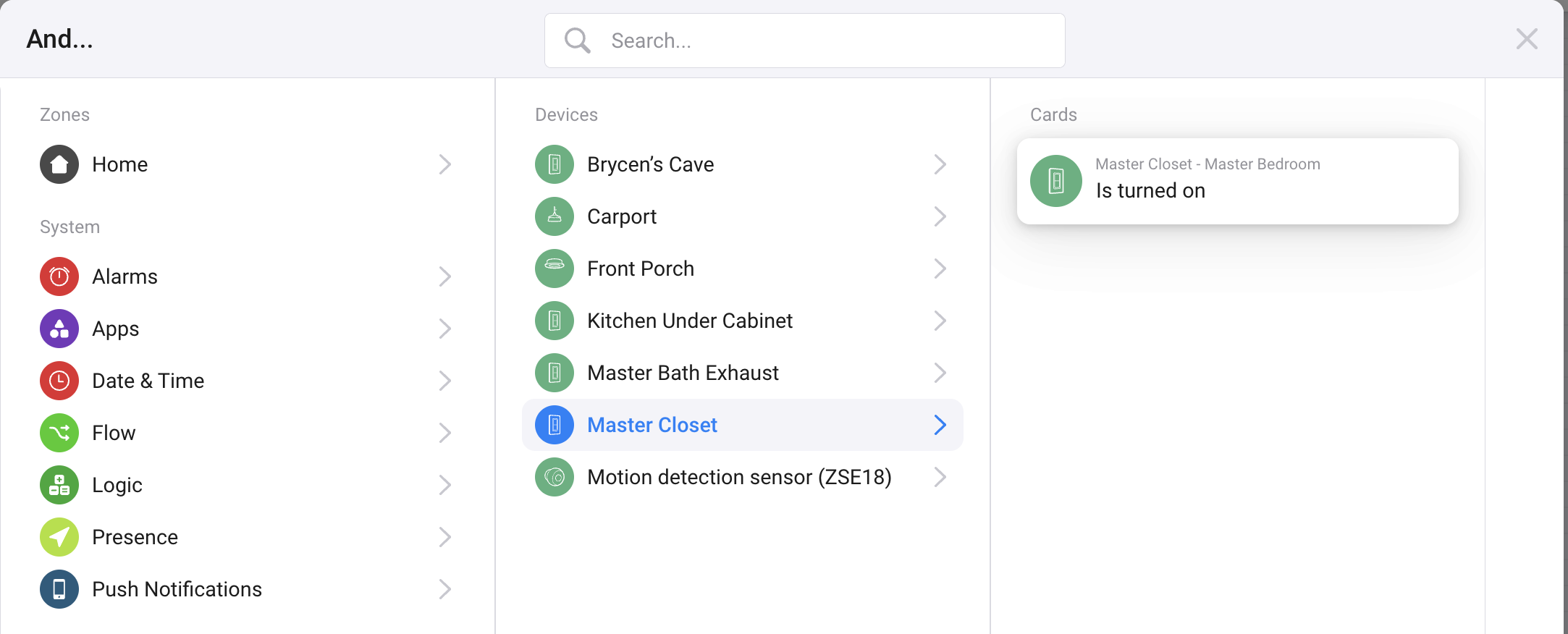I am pretty sure that this flow will work as wanted if you replace WHEN-Card âmaster-closet-masterbedroom is turned offâ with the WHEN-Card âBrycenâs Cave is turned offâ.