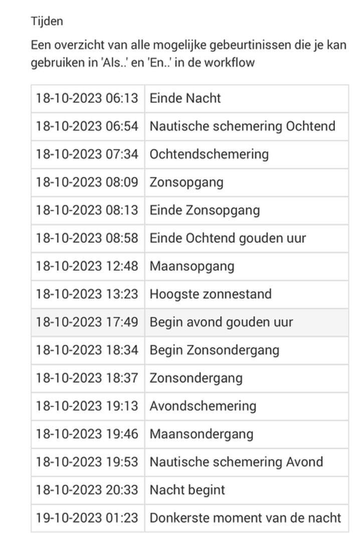 Ja dit kan ik doen met tijden tussen etc maar ik wil dit graag doen met wanneer het donker begint te worden. Aangezien de zonnestanden app automatisch meegaat met wanneer het eerder donker is etc scheelt me dit steeds aanpassen van tijden. (als jullie andere app hebben en waarvan jullie zeggen die is daar veel makkelijker voor ik sta overal voor open)