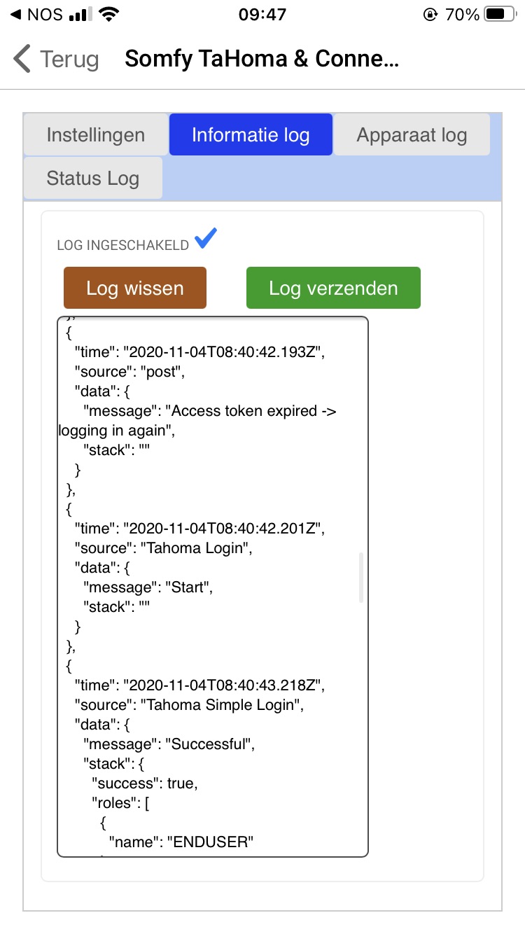 I did send the Information Log and the Device Log (Apparaat log in Dutch) to you via your app. So I hope that helps.
