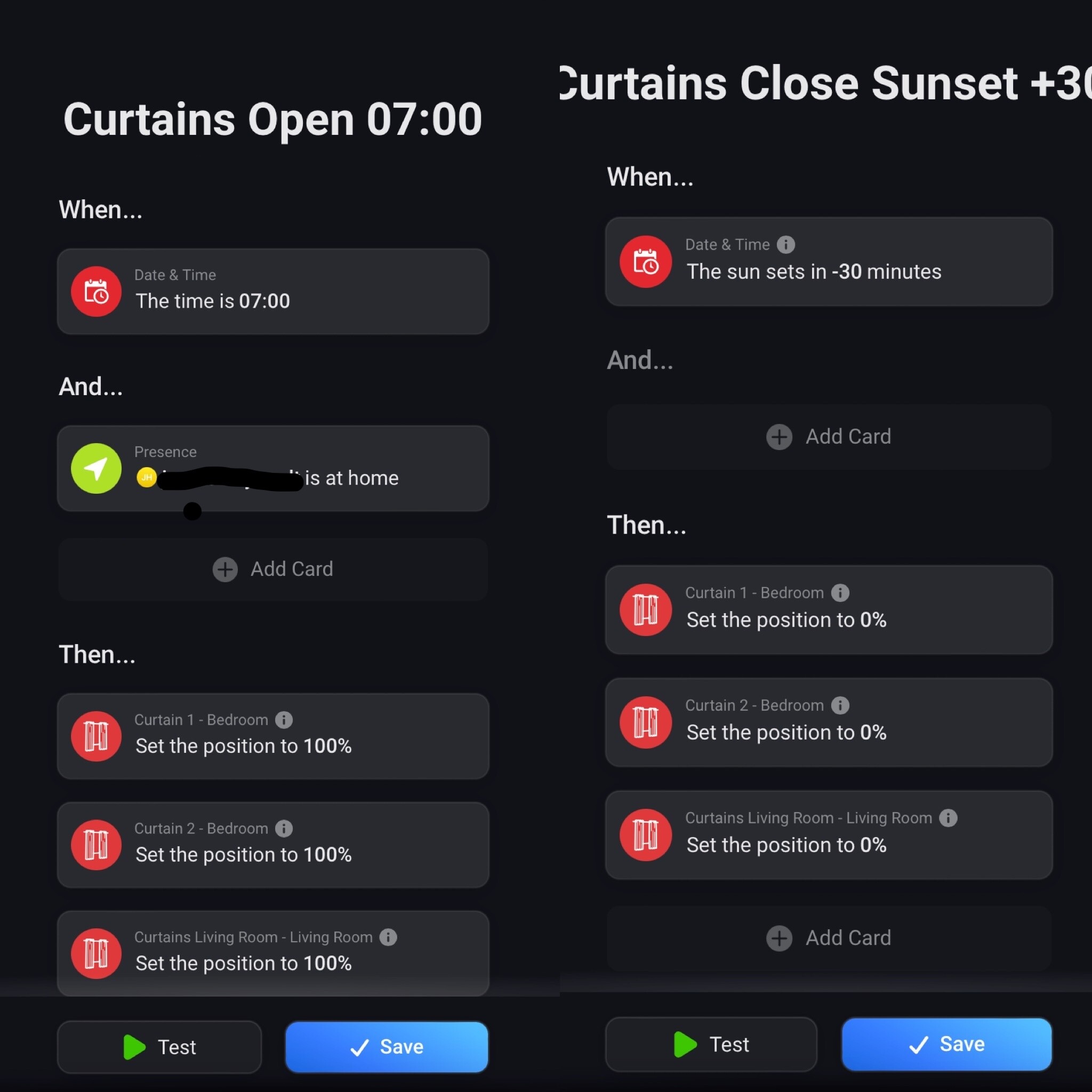I run 4 flows. One to open curtains at 7am. One to close the curtains at 30 minutes after sunset. One to open blinds at 7:30 am and one to close the blinds at sunset.