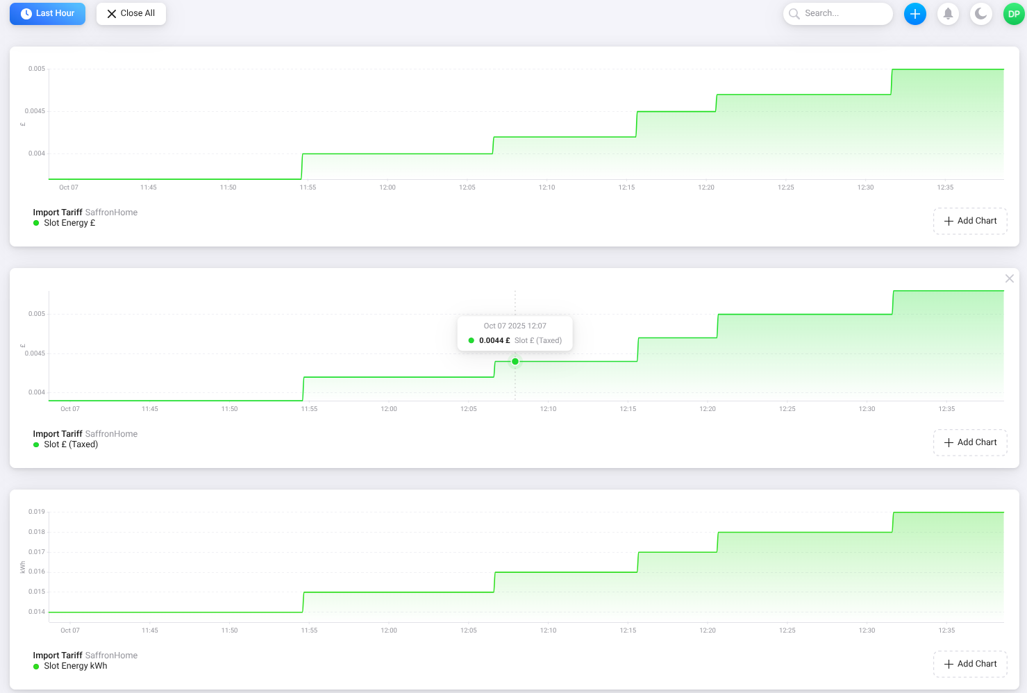 If you view the device at 16:30 (say), you see consumption that has already occurred at prices that are already “superseded” by new slot prices. You also see “next” prices that are already being applied.