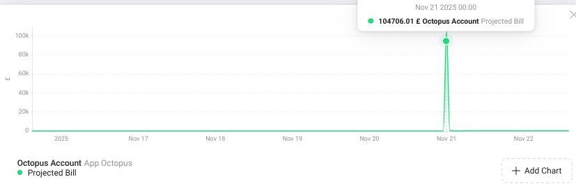 The billing period on my account just rolled over. For one minute at midnight, the projected bill was over £100,000. Whoops. A bit of smoothing is required at the beginning of the period… Here’s the “interesting” insight…