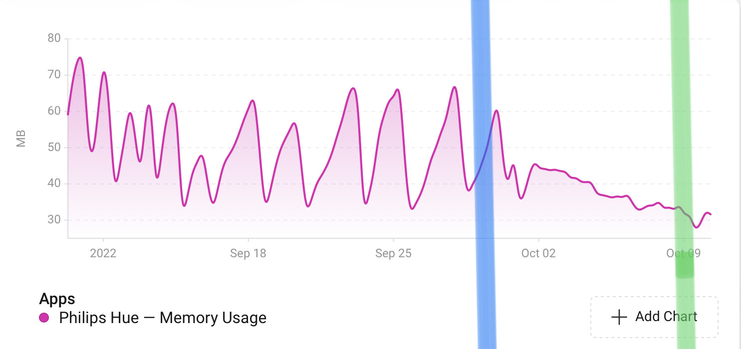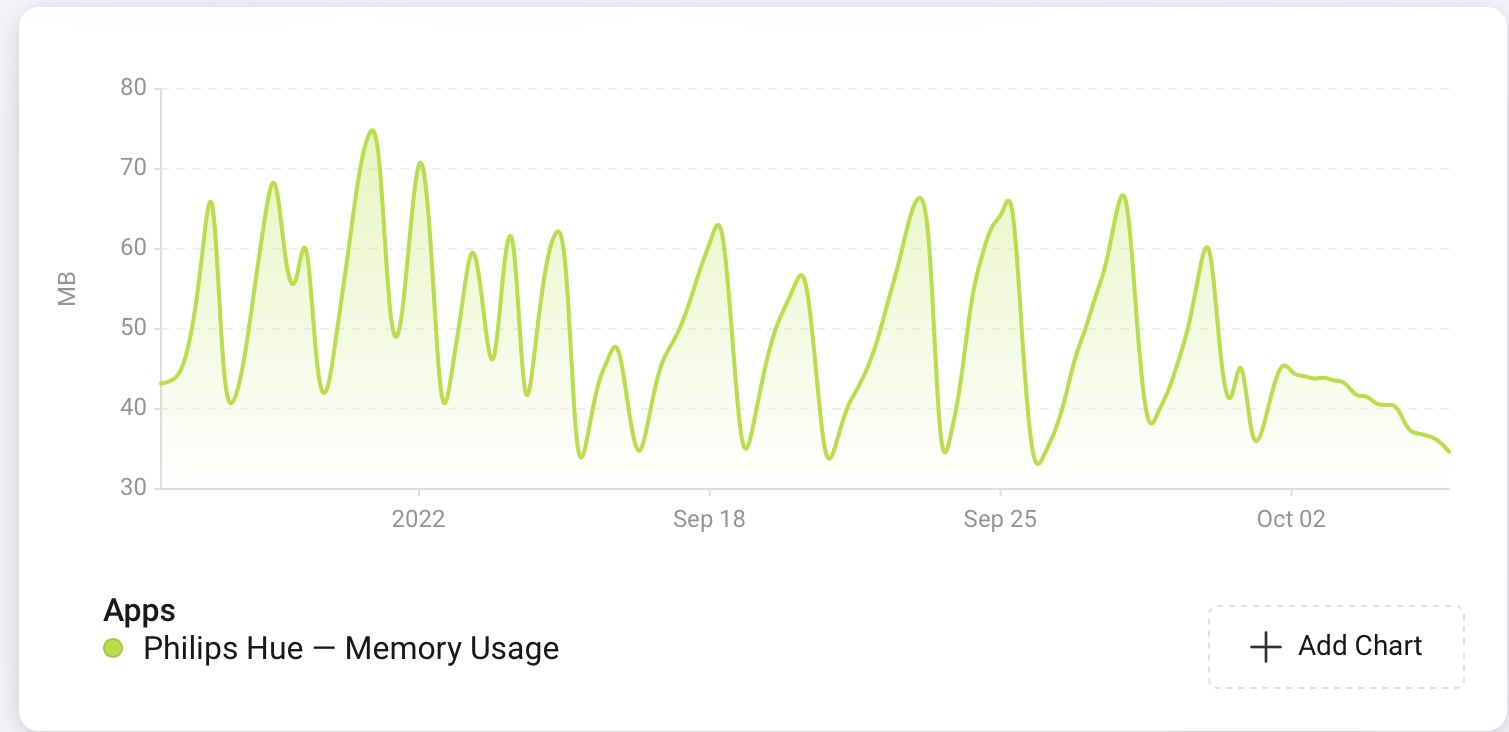 Interesting, I have 77 lamps, 12 accessories across 2 hue hubs. Memory usage runs between 24 and 31mb and thatās over the previous 5 days. I almost never have to restart Hue