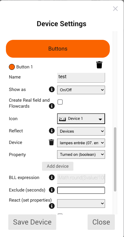 Yes/No field 1: Name: Power Show as: On/Off (Button Tab) Reflect: Devices Device: Liten lampe (Kontoret) Property: Slått på (boolean) Translates to “Powered on (boolean)” React (set properties): Yes