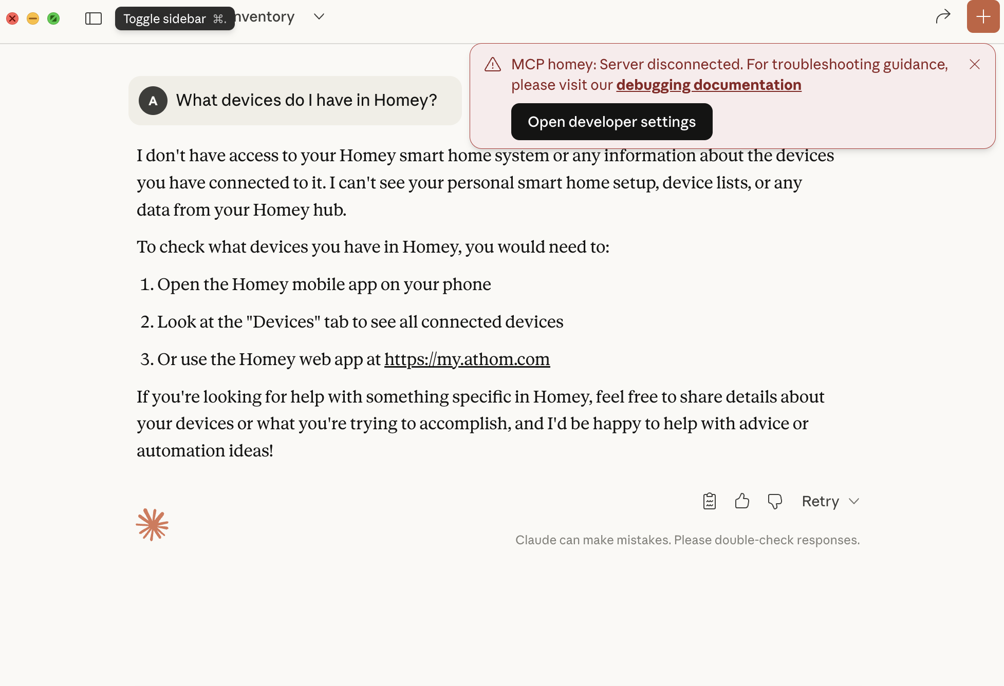 Control your Homey with AI assistants like Claude using natural language. This app uses the Model Context Protocol (MCP) to enable seamless communication between AI assistants and your Homey smart home.