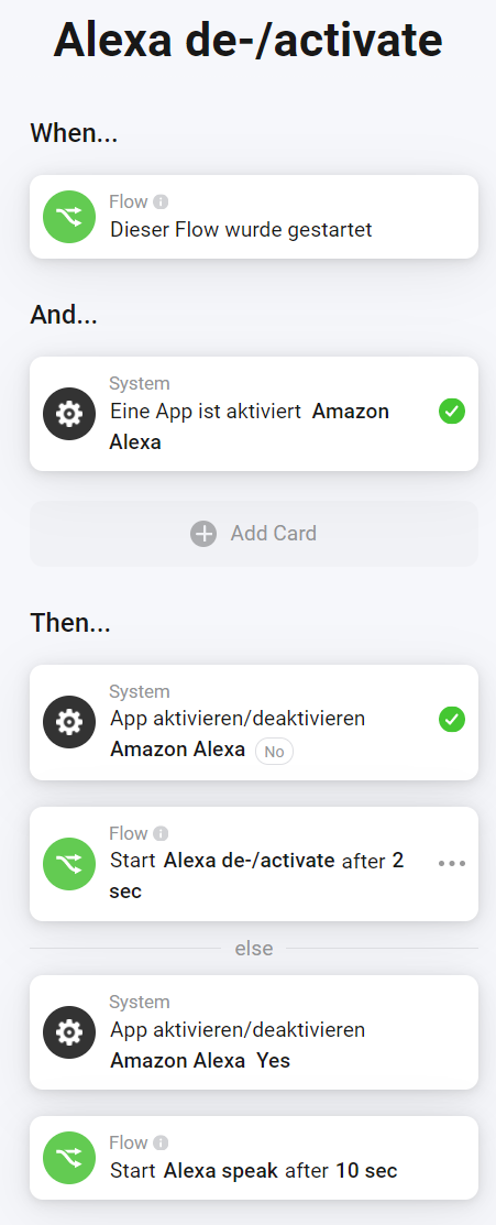 First I tried to implement the Alexa speak card in the then part of the first flow. But it didnât work because if you deactivate an app which card you use inside the same deactivation flow the flowcard becomes invalid at runtime and will not continue after reactivation of the app. But it works if you start another flow with a delay. In the delay time the second flow will become valid again.
