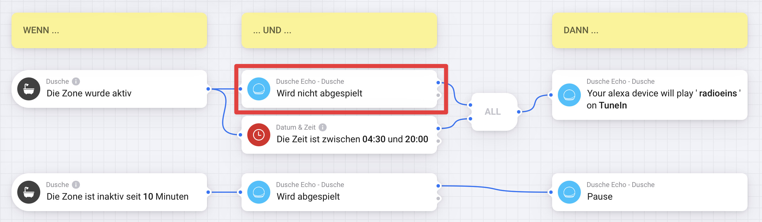 The motion sensor is set to timeout of 60 seconds. On first entry the echo plays radio from tunein (as expected). But if someone enters the room after zone is inactive and so becomes active again, the echo restart the radio sender. The condition “echo not playing” isn’t working as expected and instead of returning “echo not playing == NO” it returns “YES” again.