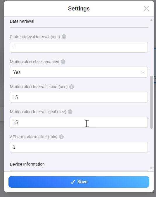 You are using local storage, right ?You can set the cloud motion alert check to a default value (60 sec). Your value is higher than the variable range