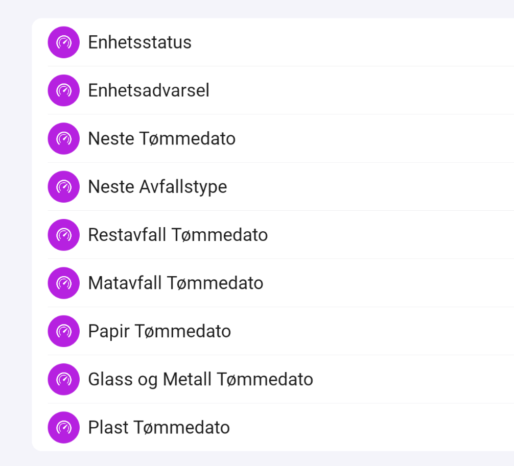 Viser egne tømmingsdatoer for Restavfall, Matavfall, Papir, Plast, Glass og Metall.