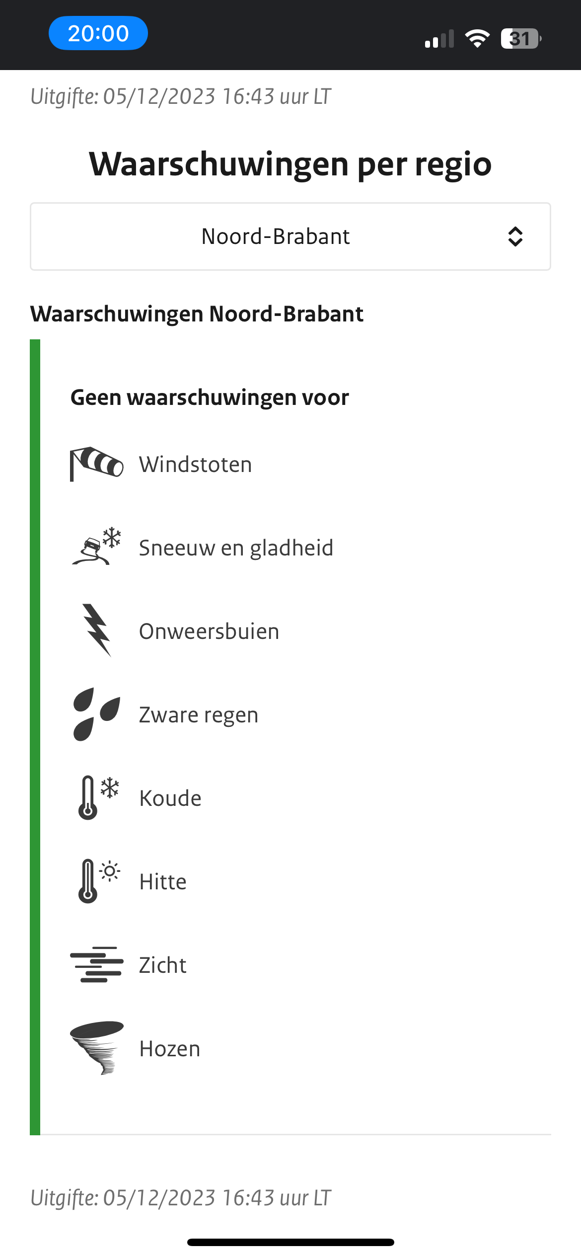 @Rassel as you can see it is still on code yellow (number 1) in sint-oedenrode in the api. Is not due to the app. KNMI (Netherlands) will indicate the same here since it uses the same api.