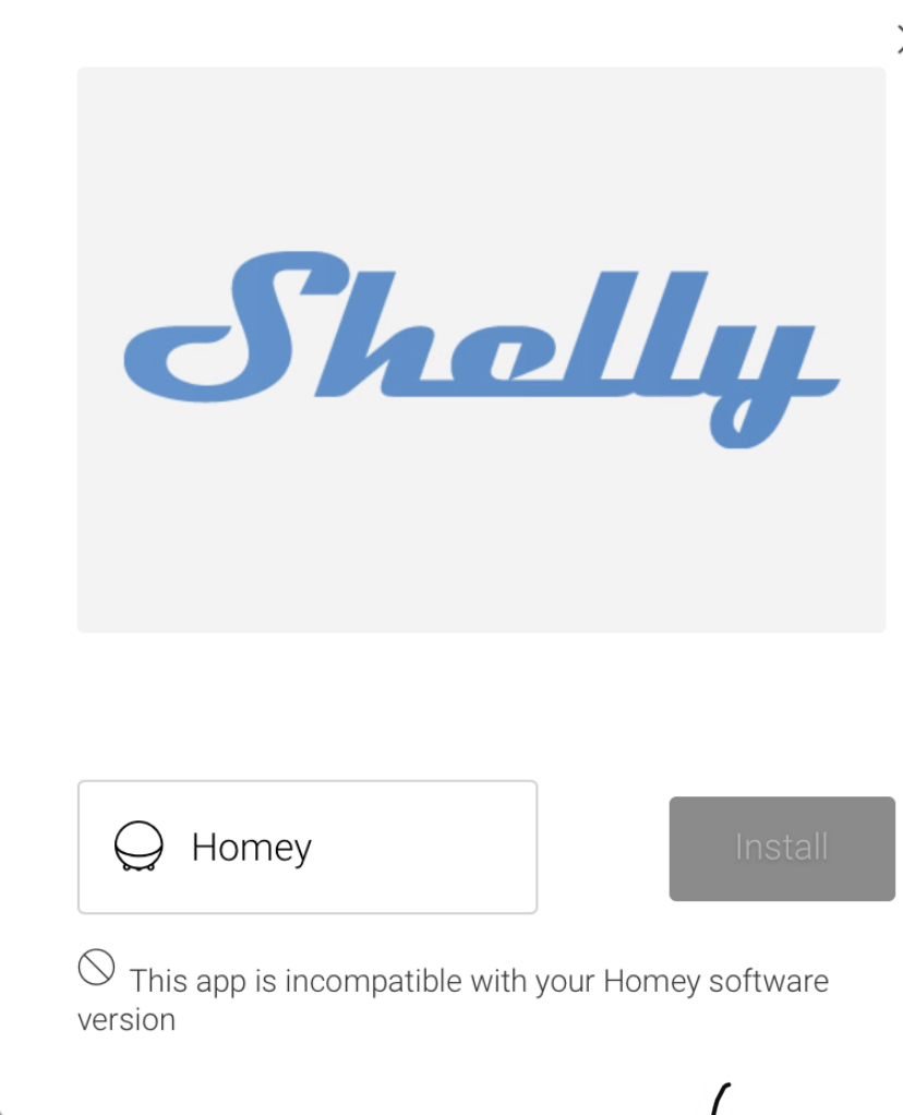Mijn Shelly producten zijn niet meer zichtbaar in de Homey app en online, het lukt niet om de app opnieuw te installeren op mijn telefoon of via de PC. Ik krijg de melding zoals in de screenprint. Ik heb al begrepen dat ik niet de enige ben. De Homey FW is up to date. Iemand een idee ? ben niet dagelijks bezig met de Homey dus kan iets simpels zijn.