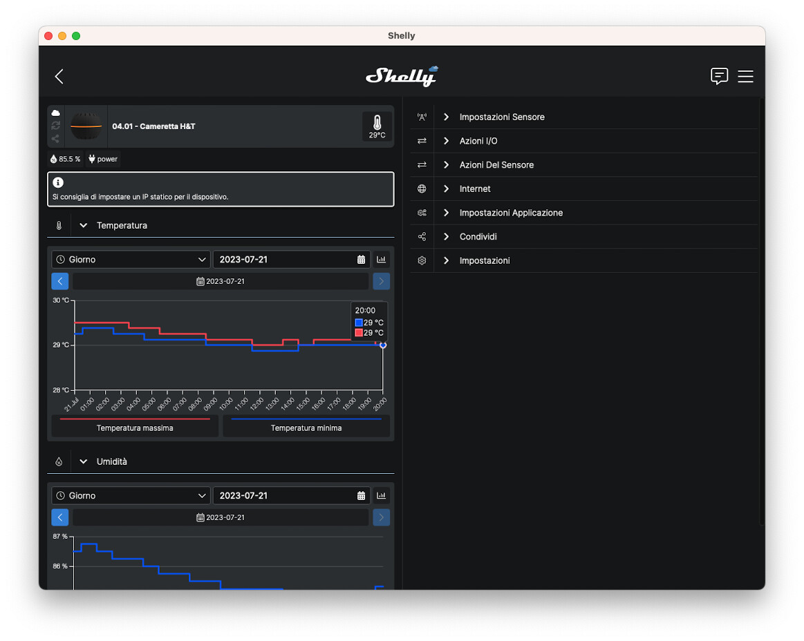 {"device":{"type":"SHHT-1","mac":"E09806955625","hostname":"shellyht-955625","sleep_mode":true},"wifi_ap":{"enabled":false,"ssid":"shellyht-955625","key":""},"wifi_sta":{"enabled":true,"ssid":"CaFi Wi-Fi","ipv4_method":"dhcp","ip":null,"gw":null,"mask":null,"dns":null},"wifi_sta1":{"enabled":false,"ssid":null,"ipv4_method":"dhcp","ip":null,"gw":null,"mask":null,"dns":null},"mqtt": {"enable":false,"server":"192.168.33.3:1883","user":"","id":"shellyht-955625","reconnect_timeout_max":60.000000,"reconnect_timeout_min":2.000000,"clean_session":true,"keep_alive":60,"max_qos":0,"retain":false,"update_period":30},"coiot": {"enabled":true,"update_period":15,"peer":"192.168.1.168:5683"},"sntp":{"server":"time.google.com","enabled":true},"login":{"enabled":false,"unprotected":false,"username":"admin"},"pin_code":"","name":null,"fw":"20230503-100134/v1.13.0-g9aed950","discoverable":false,"build_info":{"build_id":"20230503-100134/v1.13.0-g9aed950","build_timestamp":"2023-05-03T10:01:34Z","build_version":"1.0"},"cloud":{"enabled":true,"connected":true},"timezone":"Europe/Rome","lat":45.414249,"lng":8.097810,"tzautodetect":true,"tz_utc_offset":7200,"tz_dst":false,"tz_dst_auto":true,"time":"","unixtime":0,"debug_enable":false,"allow_cross_origin":false,"actions":{"active":false,"names":["report_url","temp_over_url","temp_under_url","hum_over_url","hum_under_url"]},"sensors":{"temperature_threshold":0.5,"temperature_unit":"C","humidity_threshold":0.5},"sleep_mode":{"period":10,"unit":"m"},"external_power":1,"temperature_offset":0.5,"humidity_offset":0.0}