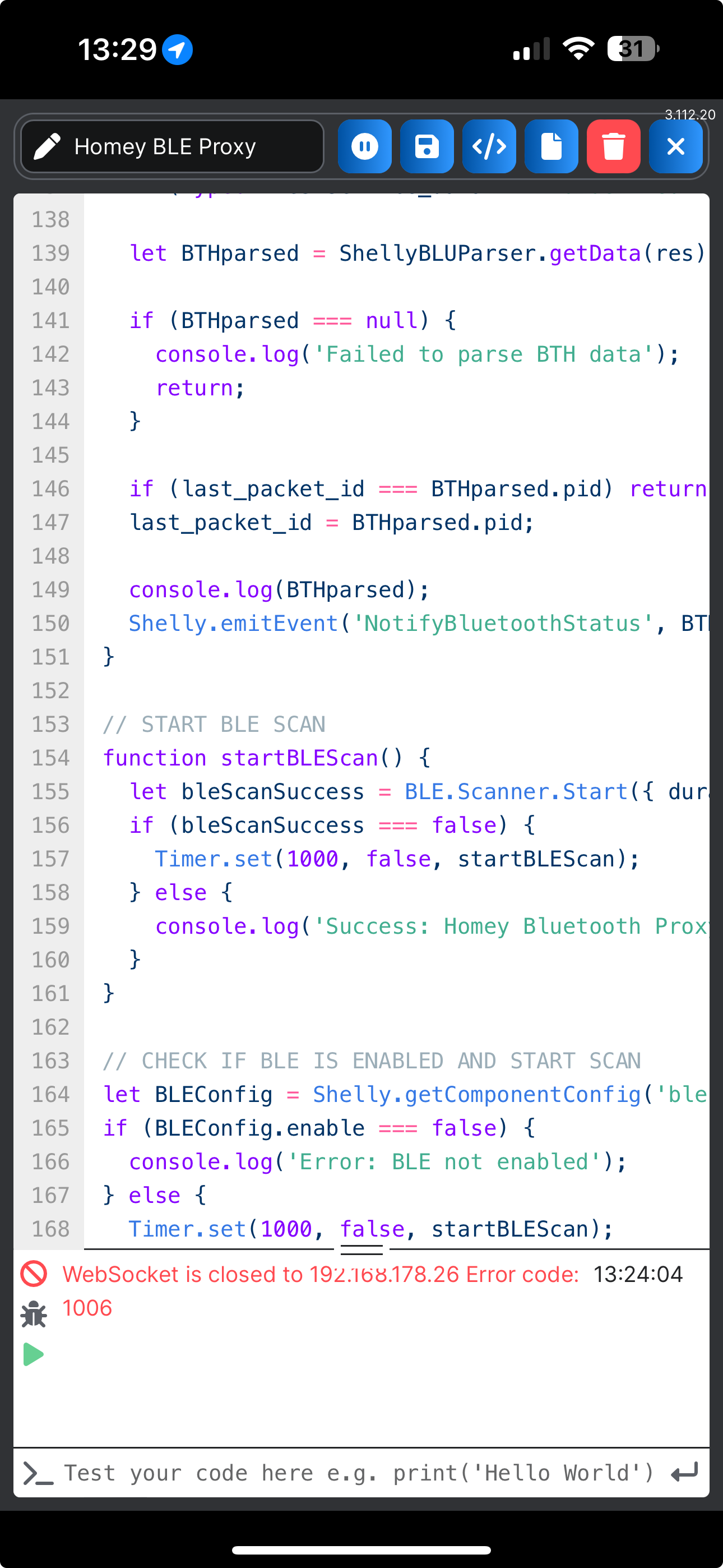 today I have checked my BLU Motion Sensor. First I made a factory reset of the BLU Motion and the 1 PM Gen3. Then I added both to the shelly app. Then I pared first the 1PM with the homey. I started the script with the maintenance option. Then I checked the script, the web socked an Bluetooth gateway with the shelly app. All is running fine.
