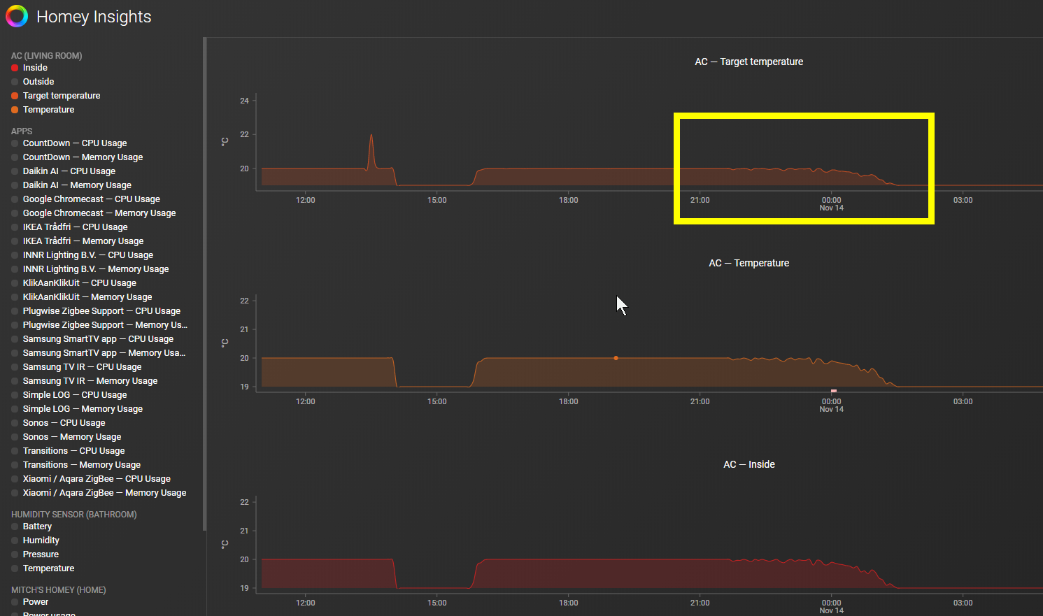 Had some difficulties setting up, but I got there eventually :-). I have a question though, when I look at Homey Insights, I see 4 graphs: “Inside”, “Outside”, “Target temperature” and “Temperature”.