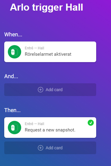 So setup a basic two step flow, first flow when motion is detected - > request new snapshot from that camera. And the second flow, once a snapshot is available, send snapshot picture over, for example telegram. This still doesnt work for me. When I “test” I get green check marks on the first flow but then nothing. If I test the second flow, I get green check mark and a picture is received on telegram as requested. But it’s not working on its own, I see that I have movement, but nothing triggers.