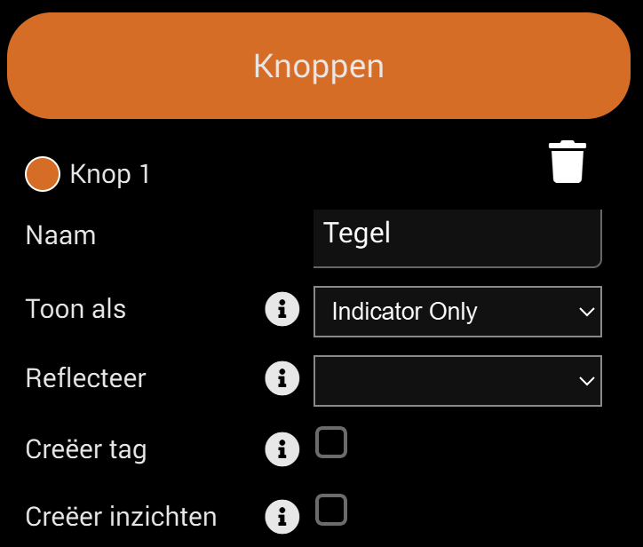 The first button item in the config of the virtual device represents the tile. You can specify it either as a non-functional ‘indicator only’ or a functional on/off button. Next you can set it via a flow to on/off (without it triggering any subsequent flows).