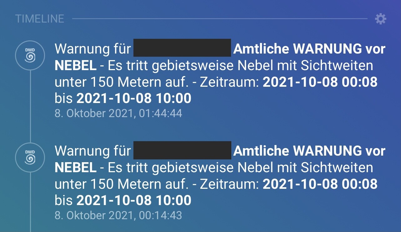 Bei DWD war das bei mir auch so, wie Ronny es beschrieben hatte. Also keine doppelte Warnung zu einem Zeitpunkt, sonder rel. viele gleiche/ähnliche Warnung mit zeitlichem Abstand. Ging mir schon auf die Nerven…