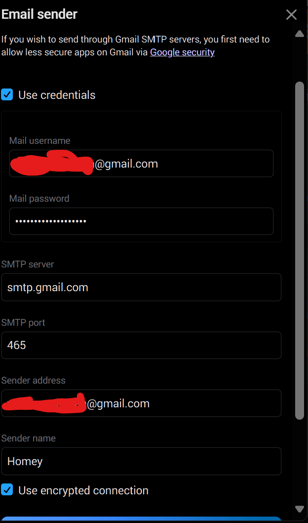 Hallo, ik probeer een email te versturen via de Homey app ‘Email versturen’. Bij het testen van de instellingen krijg ik de volgende error: 'Error: Invalid login: 535.5.7.8 Error: authentication failed.