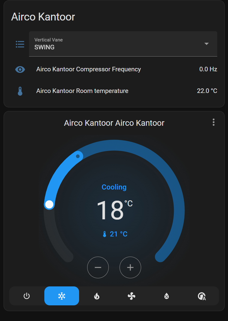 The screenshots in HA show the posiblities. For example I can set the Target Temp and I can select the mode (cooling, heating, off, etc). In HA all work fine.