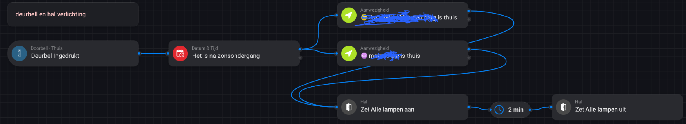 nu gaat ik proberen een flow te maken "als er aangebeld wordt’ en wij zijn thuis en het is donker dan de lichten aan in de hal. de vraag is hoe zet je deze dan weer uit…als je tips hebt dan graag.