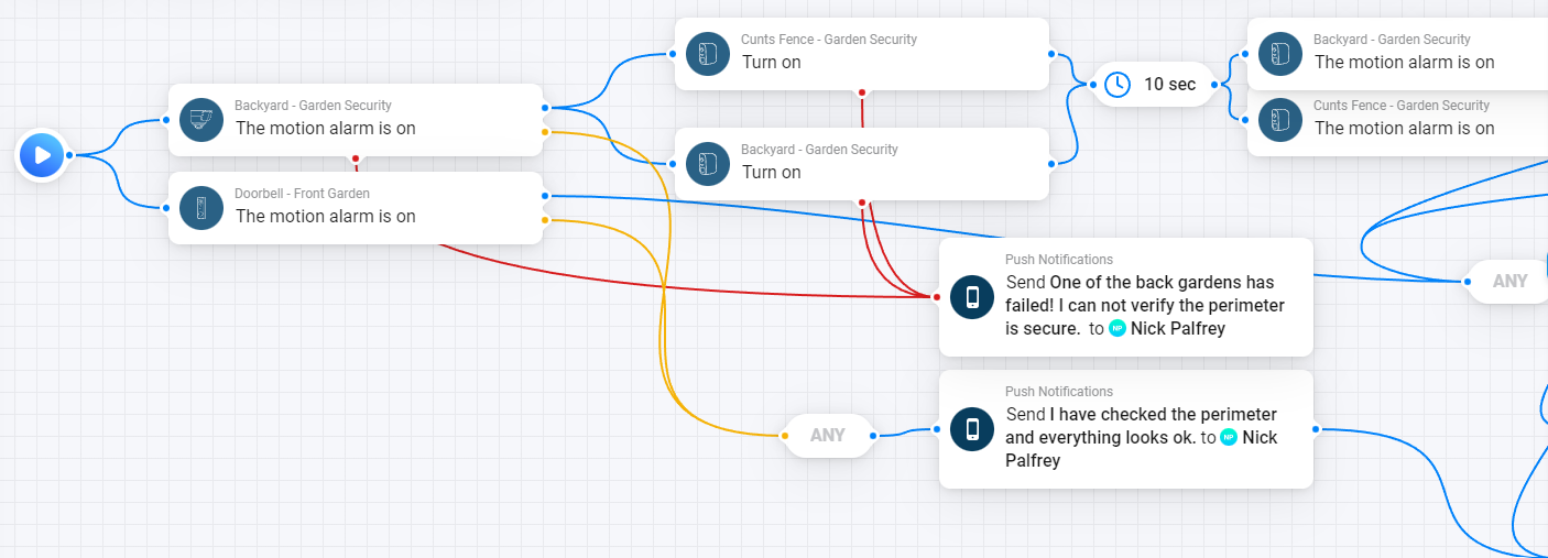 So… the attached flow for example, shows an internal and external check. Based on the trigger of motion. I am awaiting door sensors to also feed into this.