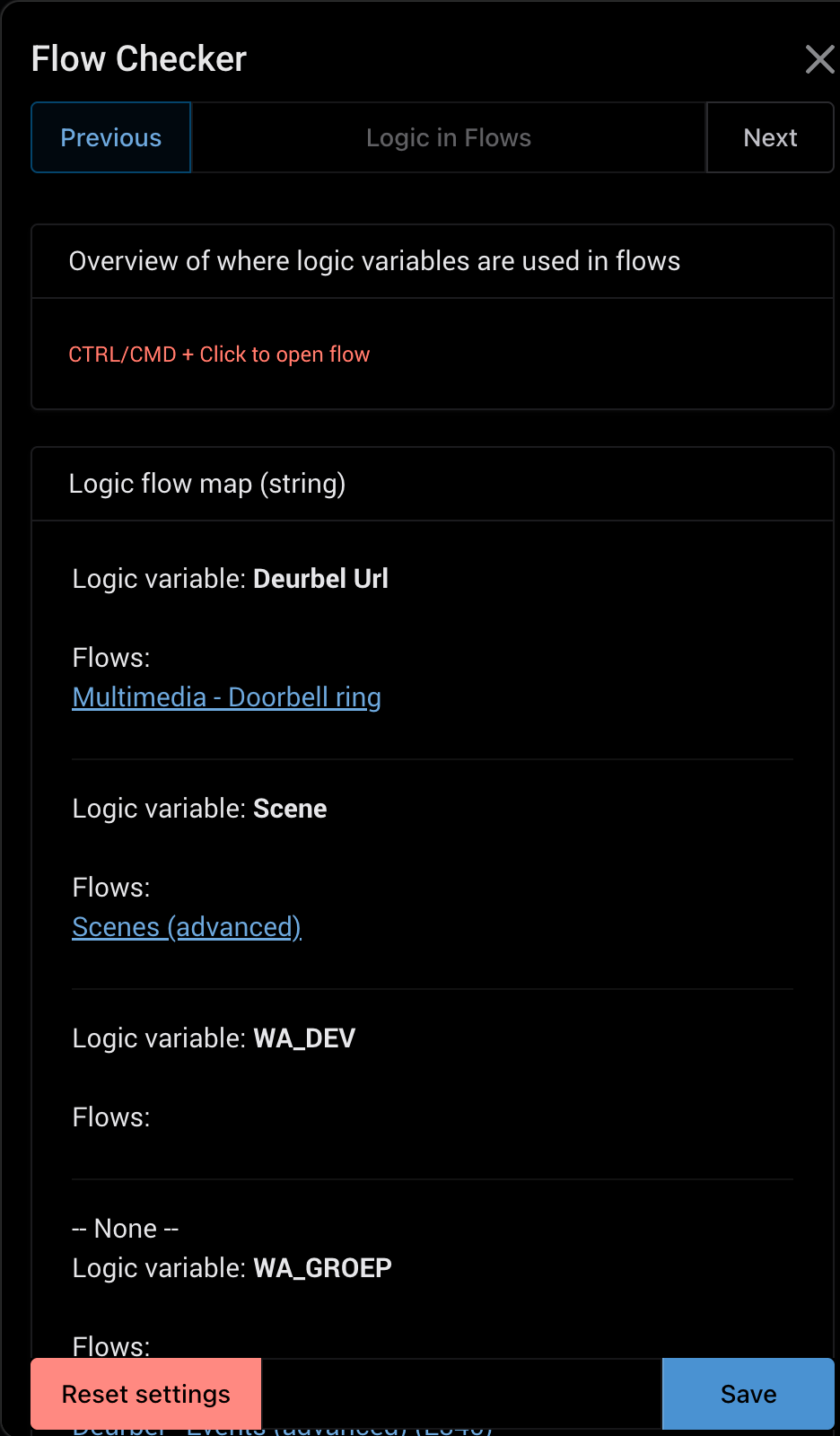 Show all Logic variables and which flows are using them. If there’s no flow the variable is unused