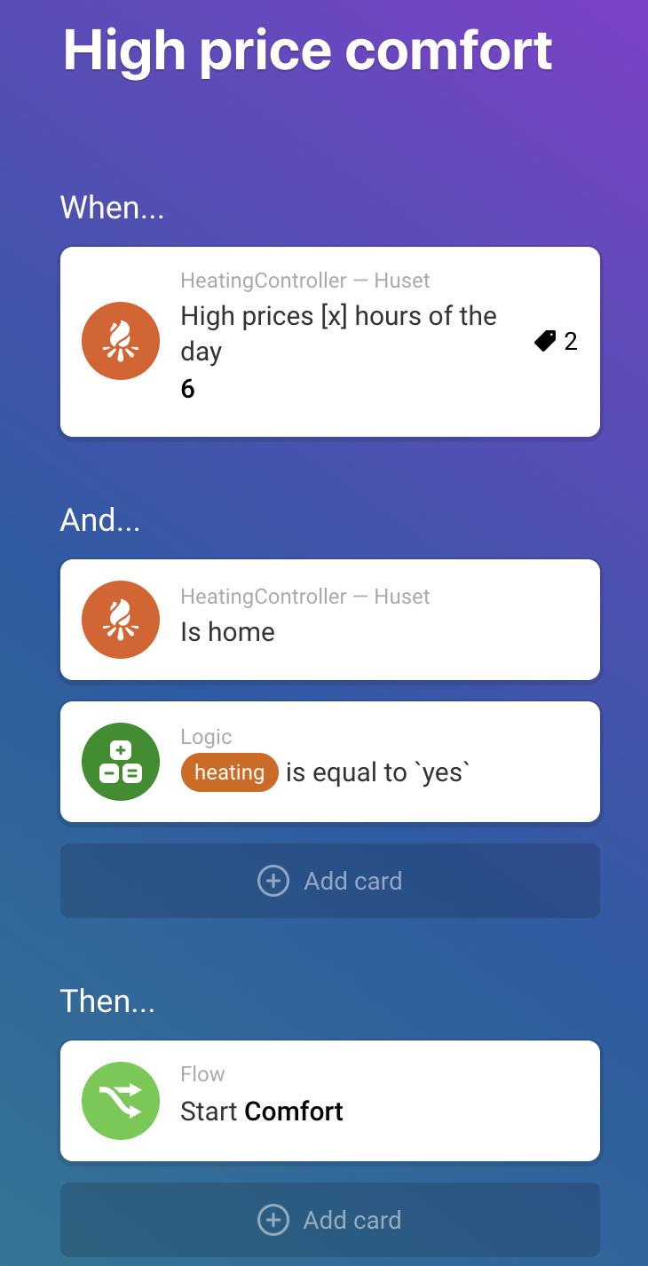 Maybe I am misunderstanding the function. I was under the impression that when there are high prices 6 hours of the day it would regulate the temperature down a couple of degrees, and outside of the 6 hours it would use the temperatures set in ‘Comfort mode’ rule, or if it was 2 consequative hours it would skip.