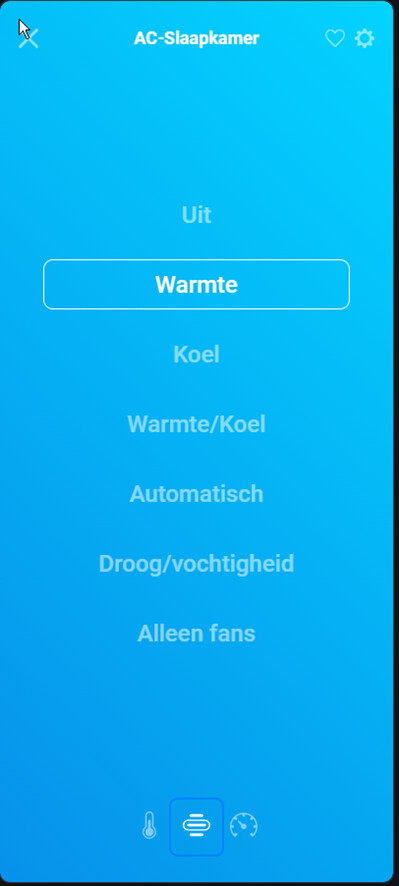The colour of the first card has a blue colour. I’m not sure if this colour is corresponding with the chosen mode of operation. If so, in this example the mode of operation was heating and then it is more logical to select a red or similar colour. If the device is switched off, the card should not have a colour at all (transparent)? Or is this just a random selected static color for this device type?