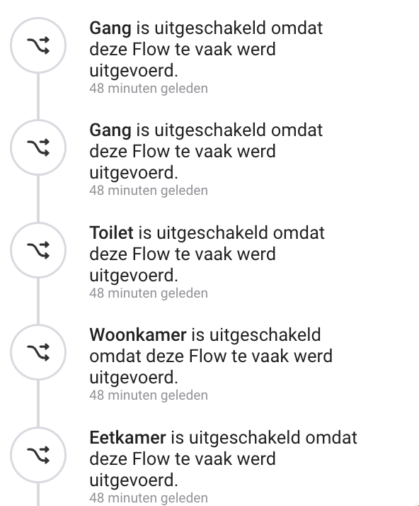 Right when I started restarting for the second time I got like 3/4 notifications per advanced flow from Homey about the flow being turned off because it was triggered too many times. See screenshot: