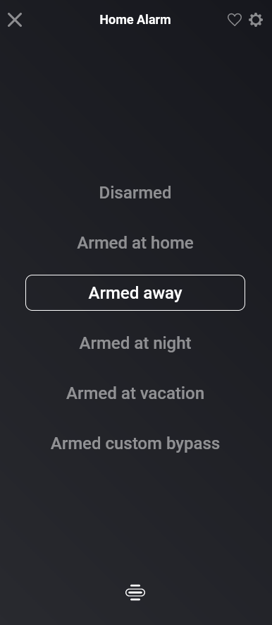 Add your alarm control panel. Currently you can change the alarm mode from Homey using the picker element. In addition you can use the flow action. A trigger can be used to react on mode changes from HA.