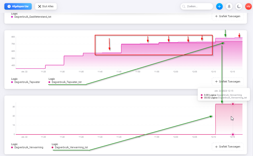 As you can see in the image. Usage below the green arrow is now seen as gas usage by my heating system instead of hot water usages. This is good!