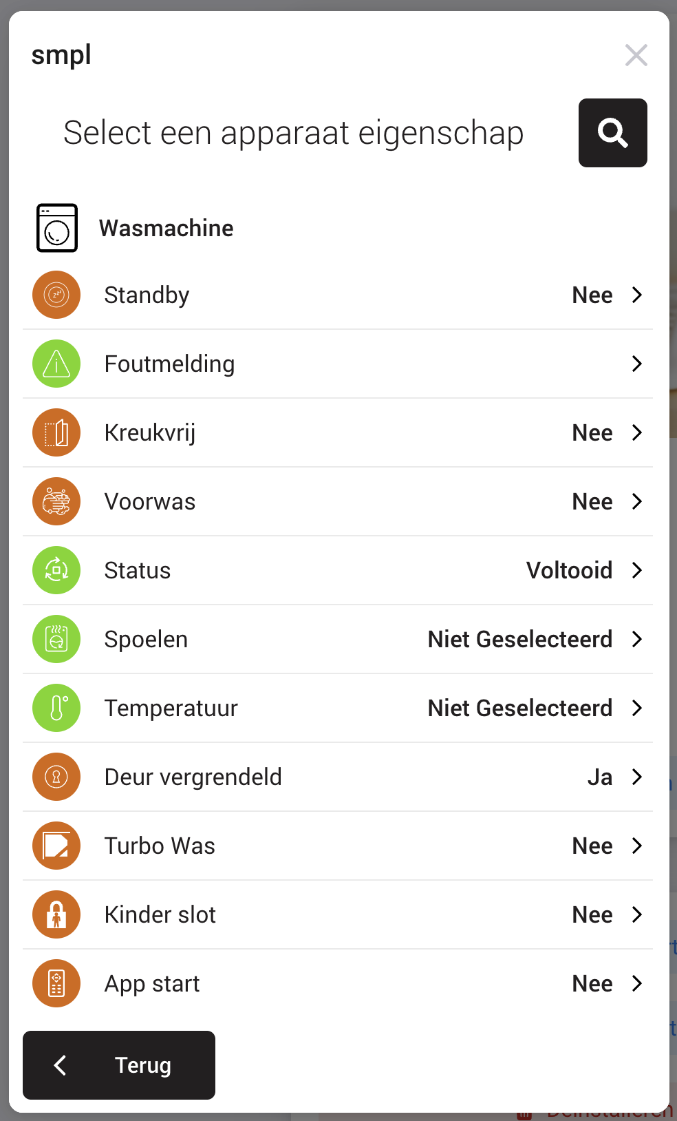 Ik ben overigens echt blij met deze integratie. Ik stuur inmiddels berichten, Alexa (echo dot) voice notificaties en zet lampen aan als de was/droger klaar is. Ook heb ik nu op een draadloze smpl (e-inkt) display een weergave voor het aftellen van de resterende tijd voor een wasprogramma. (Deze data is niet direct te selecteren vanuit de smpl app dus update ik nu elke minuut een variabel als een programma loopt, andere opties die je in de LG app hebt zitten zijn wel beschikbaar gek genoeg)