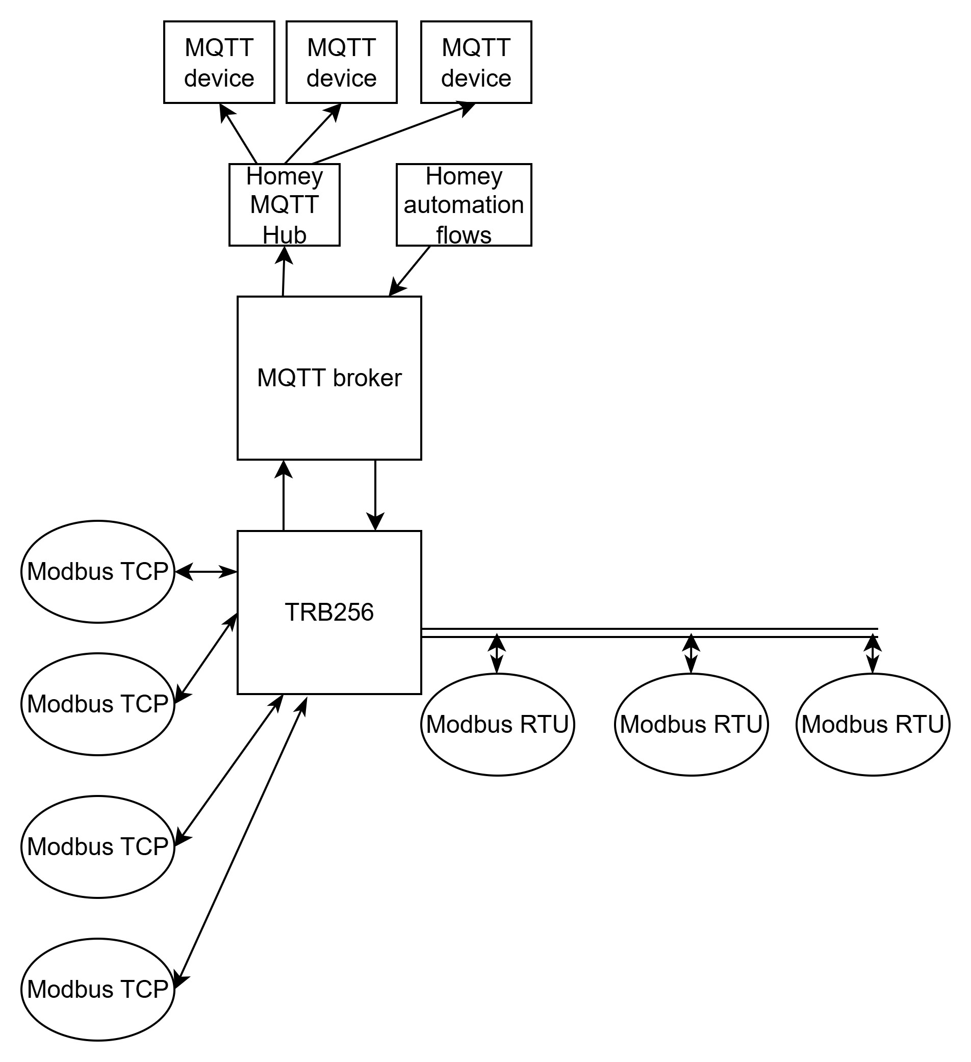 It’s the TRB256 which will sit between Homey’s (internal) MQTT broker and (any) Modbus device. It will auto retrieve the data from your Modbus device and send in to your MQTT broker, where you can pick it up with MQTT HUB and MQTT client.