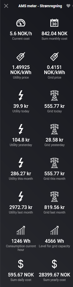 @balmli A new day has just begun, and this time my daily cost did reset to zero as it should, which is good. However, “Grid yesterday” (and “Grid this month”) still shows a unreasonably high value (667 NOK) for only being three days into the month (total energy spent so far is 133 kWh).