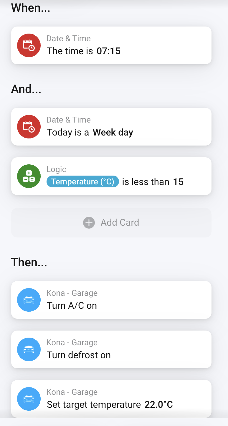 hi @Gruijter managed to get the app working well so far. have set up a flow to turn on the car’s A/C and defrost at 7:15am weekdays when the temp is below 15C. The A/C turns on without a hitch but two days in a row the defrost hasn’t come on. Any idea why this might be? could it be because I don’t have the car plugged in (i charge at work)?