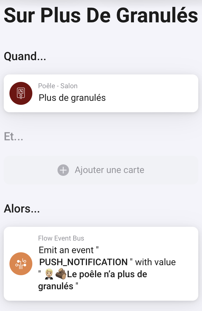 I have a flow triggered by ‘plus de granulés’ and it has never run … even when there is no more pellets in the stove …