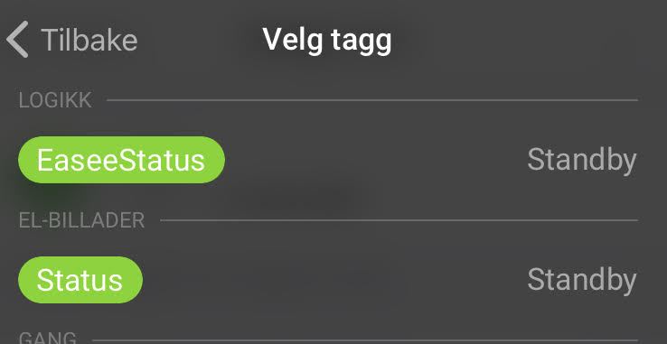 In both the cards where you set EaseeStatus, when you click the “tag-button” to select a tag, click the first tag that appears in the list. It will say “Local tags” is the header “Charger status” as tag-name.