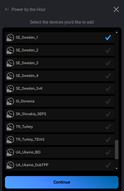 - Add a PBTH day-ahead pricing (1 hour spot prices) as Homey device, and select your market from the presented list. For Sweden (I believe you are Swedish :)) you can select from a number of market options: