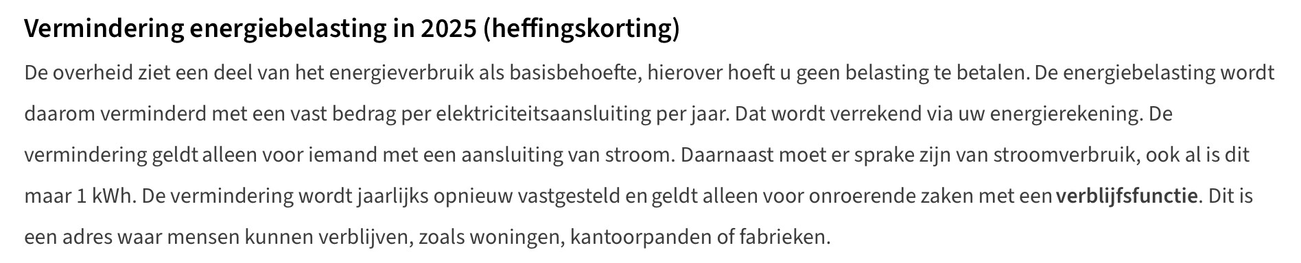 Hi Peter, There has been a reduction in energy tax in the Netherlands for years. This is because electricity is a basic need. This means that this year you will not pay any taxes at all over the first 4,000 kWh hours.