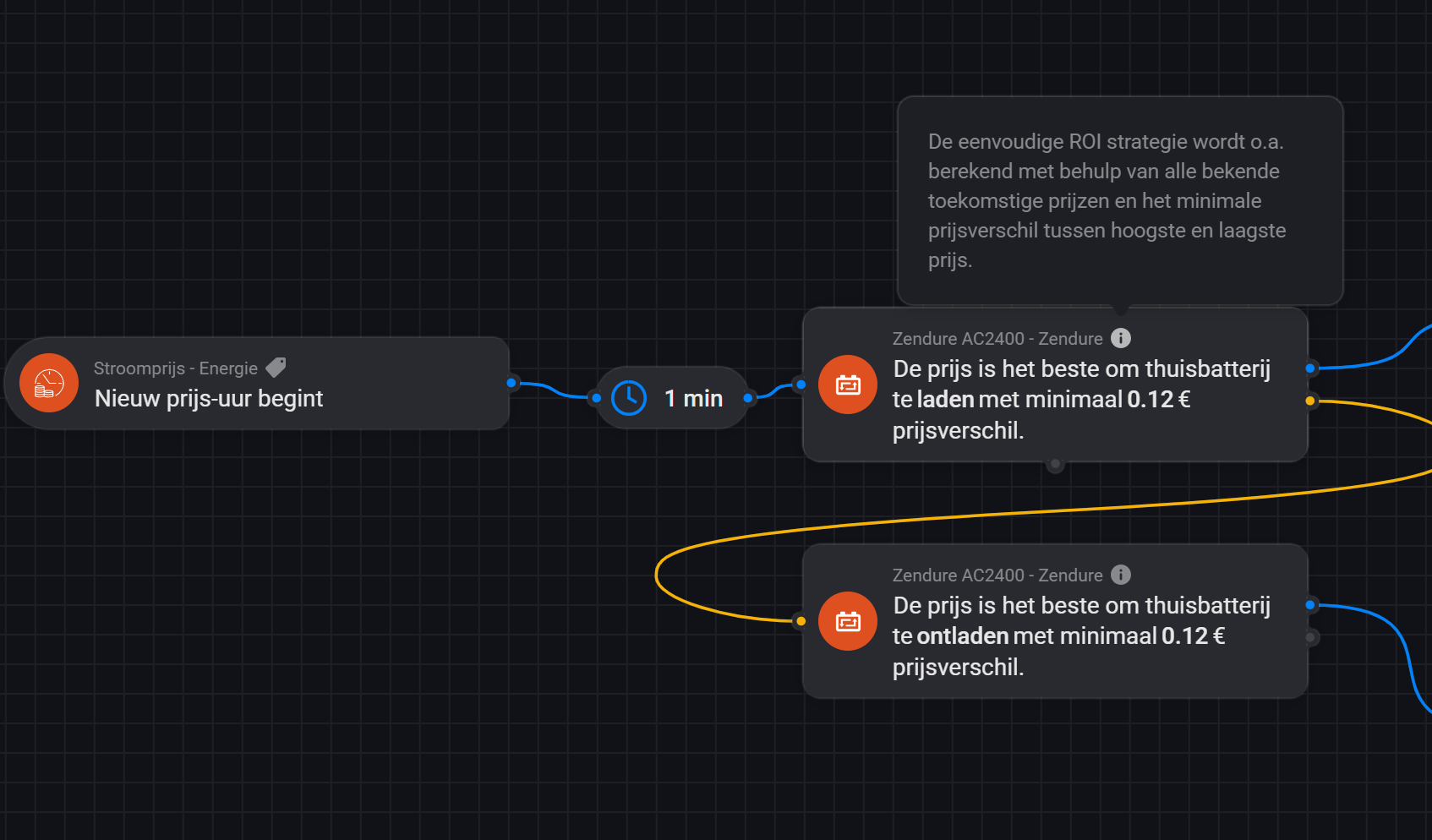 Currently I’m running it on a Homey Pro (Early 2018) and I recently installed a home battery. The ‘Thuisbatterij Monitor’, doesn’t come with the full functionality on my Homey. However, it does have a simple ROI strategy:
