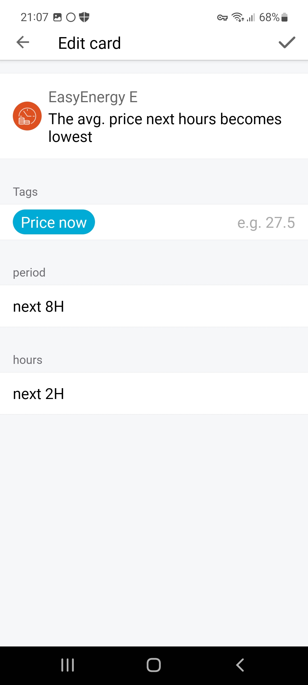 But a question. There is trigger cards for lowest prices for to day and lowest prices before a time. Iām missing same function for the highest prices. I would like to make a flow that change the start temperature for my warm water heater to 30 degrees C for de 16 most expensive hours.