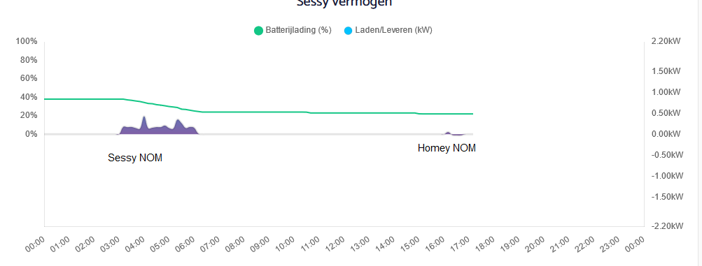 Info: Eerst stond de Sessy op NOM via de portal maar daar gebeurde ook niets, behalve tussen 3 en 6 uur vannacht, verder niets. Ook de NOM flow van Homey gedraaid: de Homey-variabele doelvermogen werd correct ge-update en doorgegeven naar de Sessy (volgens de device-info), maar het vermogen van de Sessy zelf was tussen 0 en -20 W.