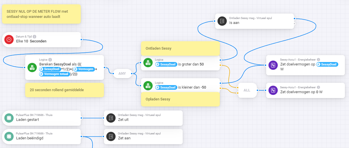 Met mijn vorige flow bleek het laden van Sessy ook te stoppen wanneer er, ondanks dat de auto laadt met 3,6 kW (het maximum), nog zonnestroom over was. De zonnepanelen leveren een gedeelte van een heldere dag meer dan 5 kW. Dat moet anders …