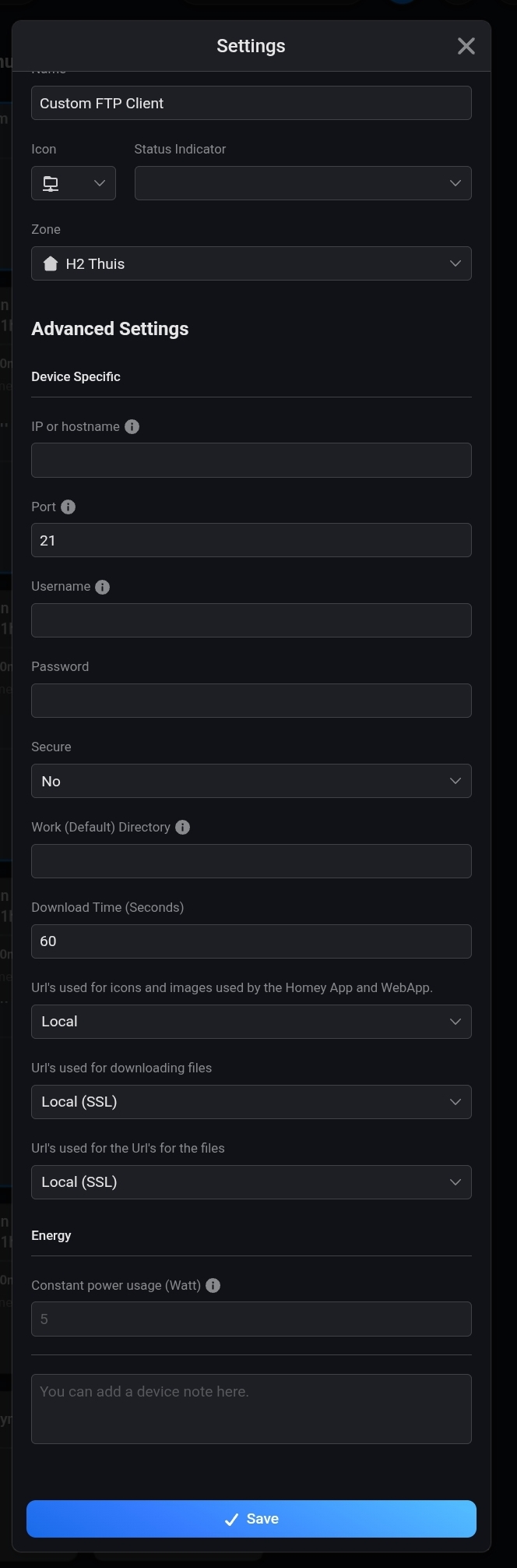 When you want to export to an online (internet) FTP server, add a “custom ftp client” as device, and when it’s added: