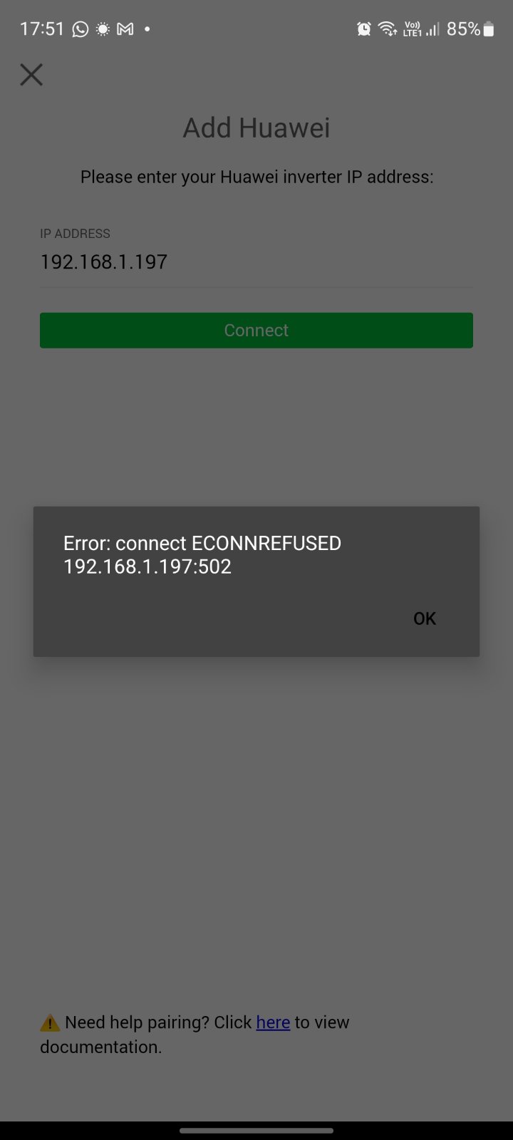 I have model: HUAWEI SUN2000-10KTL-M1 and I have the problem mentioned already, I cannot add it via IP address and I get this error message. I have read the instructions in the app and they are met.