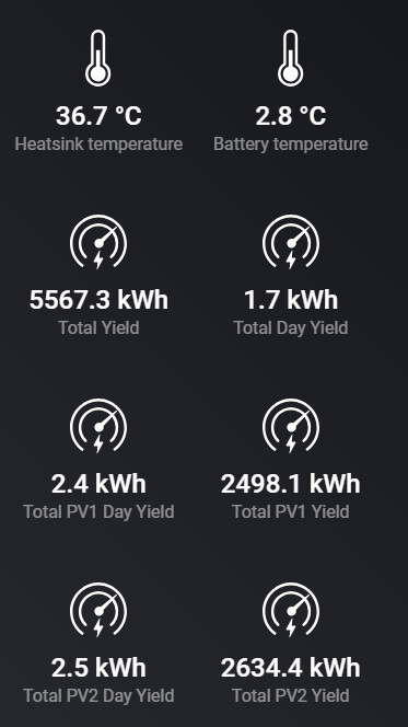 The other thing is the Total Day Yeld which shows 1.7 kWh, however the Total Pv1 Day Yeld and Total Pv2 Day Yeld accumulates to 4.9 kWh. This is what the Growatt webinterface shows as well, so thereâs something wrong with the Total Day Yeld ![]()