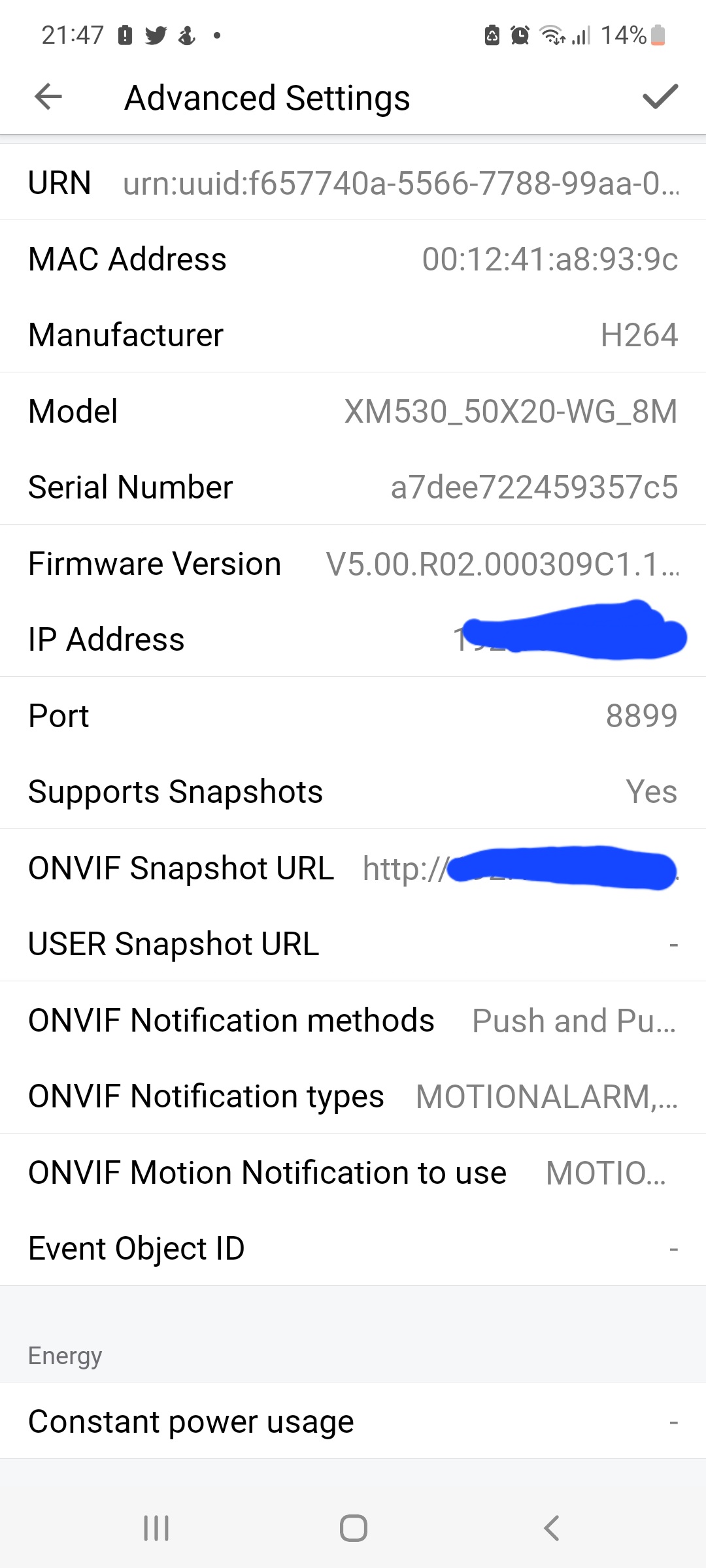 It looks to me that montion is permanently activated in your app (sending screen shot) and cannot detect any action (that’s why I was not able to seen anything in log file). Btw, the same result was for official ver. 2.0.12. from setup point of view, I went through this forum and configured device like it was commented here.