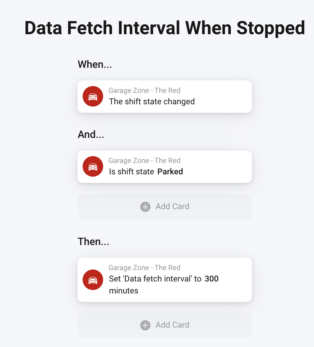 If I set the data fetch interval to a small value, the car will be woken up very often and as a result the battery will get drained rapidly. This is the reason I am trying to create flows that will change the “fetch interval” value.
